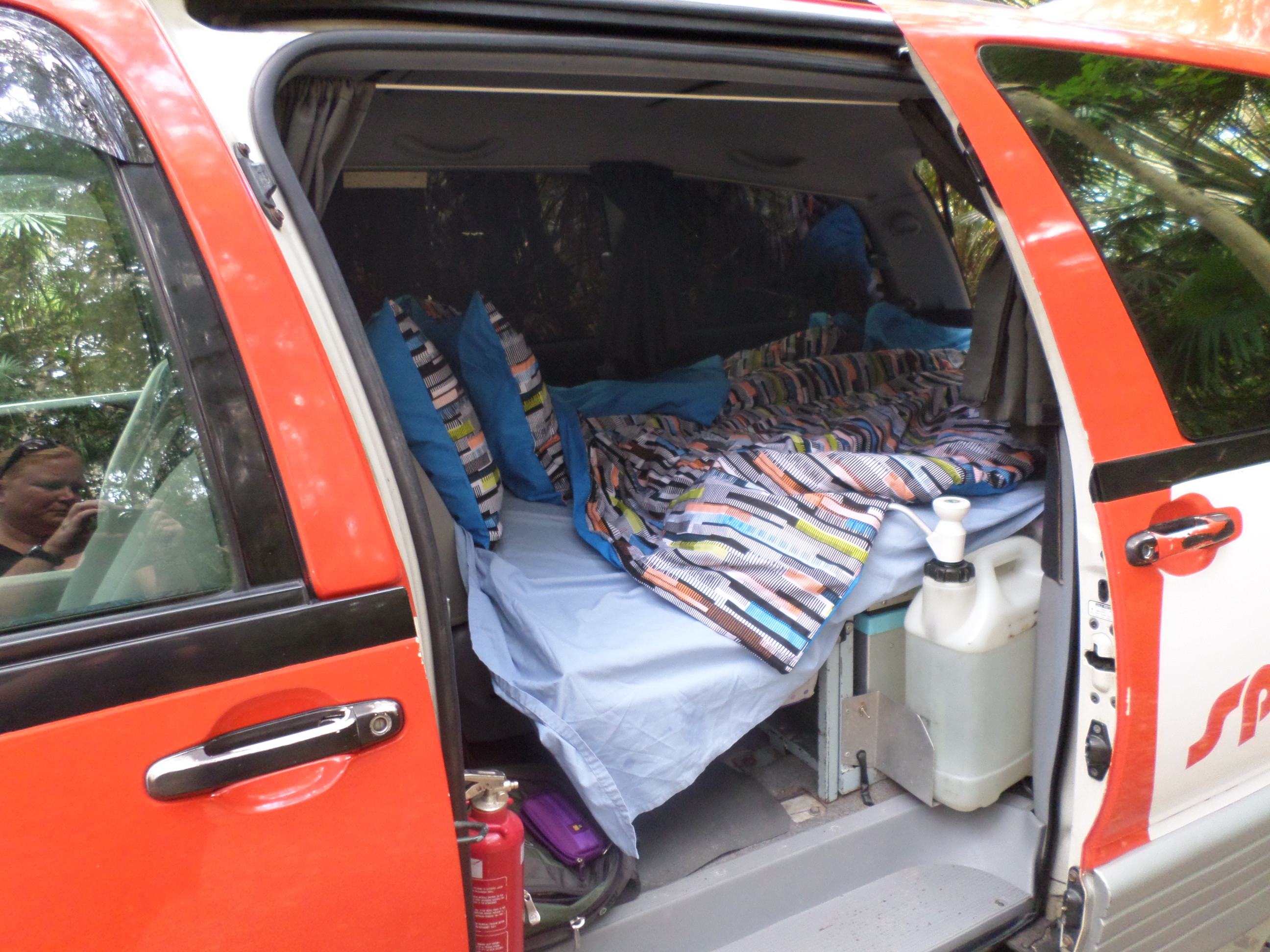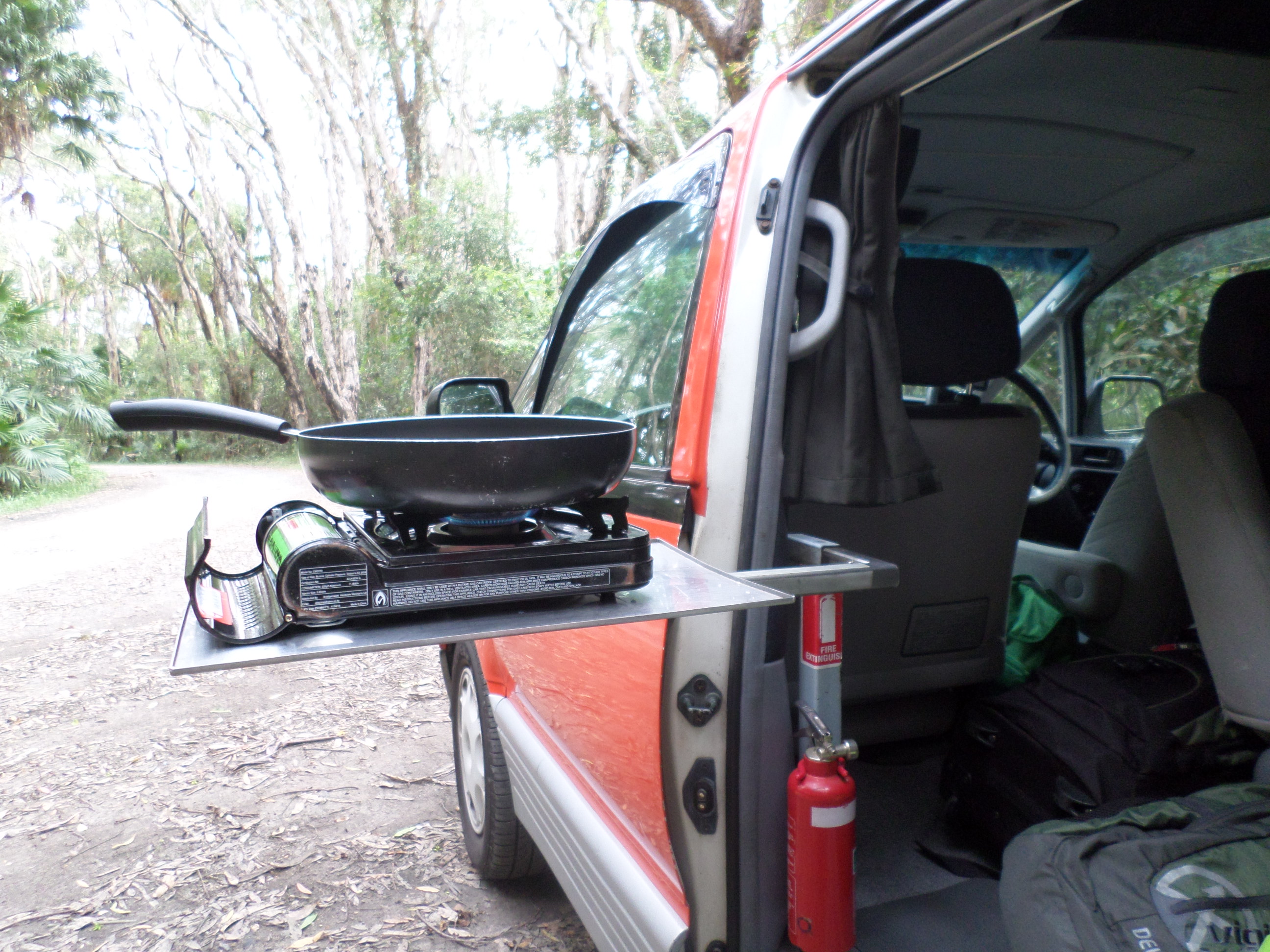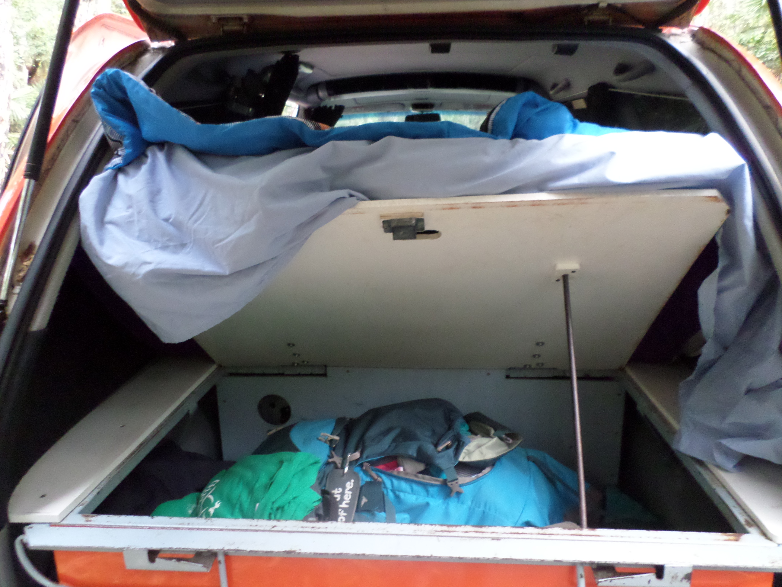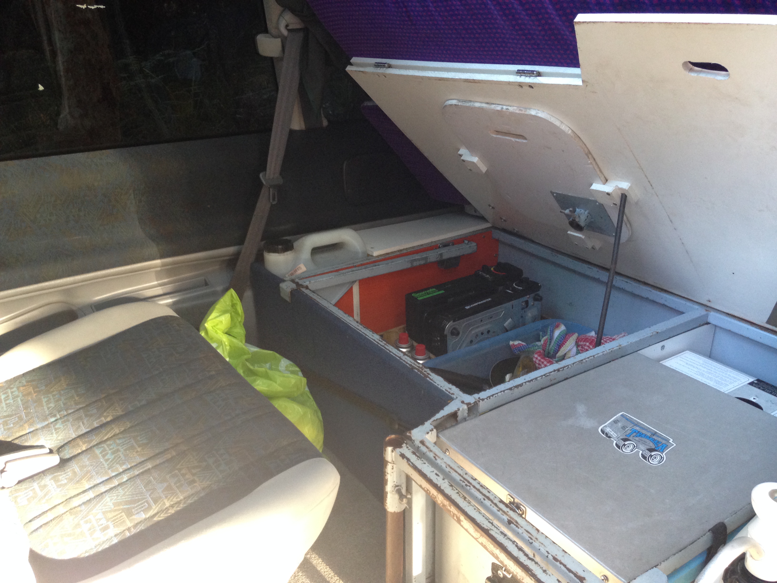 There is storage under the front of the bed for the stove, utensils, and dry food. There is also a small refrigerator which is that silver thing on the right. Next to the fridge is a water jug as well. The car has two batteries. One functions like normal, helping the car to start. The other is to run the fridge, lights, DVD player, radio, etc.
